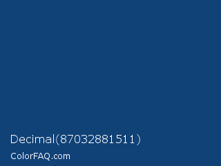 Decimal 87032881511 Color is a dark blue color and the nearest color is Dark Cerulean #08457e. Hex code #104277 and RGB value is rgb(16,66,119). In RGB color space, this color is composed of 6% red, 26% green, 47% blue, In CMYK color space, this color is composed of 87% cyan, 45% magenta, 0% yellow , 53% black , In HSL color space, this color has a hue angle of 211° , 76% saturation and 26% lightness.