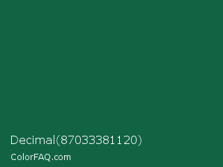Decimal 87033381120 Color is a dark green color and the nearest color is Jewel #126b40. Hex code #116344 and RGB value is rgb(17,99,68). In RGB color space, this color is composed of 7% red, 39% green, 27% blue, In CMYK color space, this color is composed of 83% cyan, 0% magenta, 31% yellow , 61% black , In HSL color space, this color has a hue angle of 157° , 71% saturation and 23% lightness.