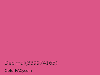 Decimal 339974165 Color is a normal rose color and the nearest color is Fandango Pink #de5285. Hex code #dc5587 and RGB value is rgb(220,85,135). In RGB color space, this color is composed of 86% red, 33% green, 53% blue, In CMYK color space, this color is composed of 0% cyan, 61% magenta, 39% yellow , 14% black , In HSL color space, this color has a hue angle of 338° , 66% saturation and 60% lightness.