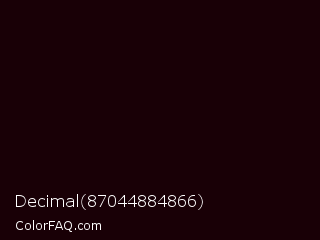 Decimal 87044884866 Color is a almost black red color and the nearest color is Diesel #130000. Hex code #190006 and RGB value is rgb(25,0,6). In RGB color space, this color is composed of 10% red, 0% green, 2% blue, In CMYK color space, this color is composed of 0% cyan, 100% magenta, 76% yellow , 90% black , In HSL color space, this color has a hue angle of 346° , 100% saturation and 5% lightness.