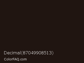 Decimal 87049908513 Color is a very dark orange color and the nearest color is Night Rider #1f120f. Hex code #201511 and RGB value is rgb(32,21,17). In RGB color space, this color is composed of 13% red, 8% green, 7% blue, In CMYK color space, this color is composed of 0% cyan, 34% magenta, 47% yellow , 87% black , In HSL color space, this color has a hue angle of 16° , 31% saturation and 10% lightness.