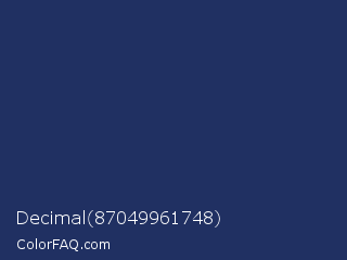 Decimal 87049961748 Color is a dark blue color and the nearest color is Biscay #1b3162. Hex code #203062 and RGB value is rgb(32,48,98). In RGB color space, this color is composed of 13% red, 19% green, 38% blue, In CMYK color space, this color is composed of 67% cyan, 51% magenta, 0% yellow , 62% black , In HSL color space, this color has a hue angle of 225° , 51% saturation and 25% lightness.