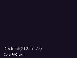 Decimal 21255177 Color is a almost black violet color and the nearest color is Vulcan #10121d. Hex code #160e21 and RGB value is rgb(22,14,33). In RGB color space, this color is composed of 9% red, 5% green, 13% blue, In CMYK color space, this color is composed of 33% cyan, 58% magenta, 0% yellow , 87% black , In HSL color space, this color has a hue angle of 265° , 40% saturation and 9% lightness.