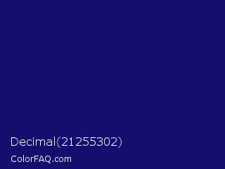 Decimal 21255302 Color is a dark indigo color and the nearest color is Arapawa #110c6c. Hex code #160e6e and RGB value is rgb(22,14,110). In RGB color space, this color is composed of 9% red, 5% green, 43% blue, In CMYK color space, this color is composed of 80% cyan, 87% magenta, 0% yellow , 57% black , In HSL color space, this color has a hue angle of 245° , 77% saturation and 24% lightness.