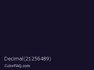 Decimal 21256489 Color is a very dark indigo color and the nearest color is Mirage #161928. Hex code #161029 and RGB value is rgb(22,16,41). In RGB color space, this color is composed of 9% red, 6% green, 16% blue, In CMYK color space, this color is composed of 46% cyan, 61% magenta, 0% yellow , 84% black , In HSL color space, this color has a hue angle of 254° , 44% saturation and 11% lightness.