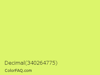 Decimal 340264775 Color is a light lime color and the nearest color is Booger Buster #dde26a. Hex code #dcf56b and RGB value is rgb(220,245,107). In RGB color space, this color is composed of 86% red, 96% green, 42% blue, In CMYK color space, this color is composed of 10% cyan, 0% magenta, 56% yellow , 4% black , In HSL color space, this color has a hue angle of 71° , 87% saturation and 69% lightness.