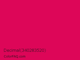 Decimal 340283520 Color is a normal rose color and the nearest color is Razzmatazz Crayola #e30b5c. Hex code #dd0658 and RGB value is rgb(221,6,88). In RGB color space, this color is composed of 87% red, 2% green, 35% blue, In CMYK color space, this color is composed of 0% cyan, 97% magenta, 60% yellow , 13% black , In HSL color space, this color has a hue angle of 337° , 95% saturation and 45% lightness.