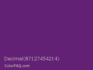 Decimal 87127454214 Color is a dark purple color and the nearest color is Midnight #702670. Hex code #632176 and RGB value is rgb(99,33,118). In RGB color space, this color is composed of 39% red, 13% green, 46% blue, In CMYK color space, this color is composed of 16% cyan, 72% magenta, 0% yellow , 54% black , In HSL color space, this color has a hue angle of 287° , 56% saturation and 30% lightness.