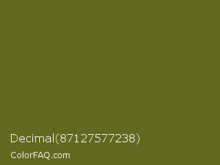 Decimal 87127577238 Color is a dark yellow color and the nearest color is Fern Frond #657220. Hex code #636820 and RGB value is rgb(99,104,32). In RGB color space, this color is composed of 39% red, 41% green, 13% blue, In CMYK color space, this color is composed of 5% cyan, 0% magenta, 69% yellow , 59% black , In HSL color space, this color has a hue angle of 64° , 53% saturation and 27% lightness.