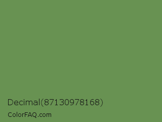 Decimal 87130978168 Color is a normal green color and the nearest color is Highland #6f8e63. Hex code #689252 and RGB value is rgb(104,146,82). In RGB color space, this color is composed of 41% red, 57% green, 32% blue, In CMYK color space, this color is composed of 29% cyan, 0% magenta, 44% yellow , 43% black , In HSL color space, this color has a hue angle of 99° , 28% saturation and 45% lightness.