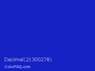 Decimal 21300278 Color is a normal blue color and the nearest color is Persian Blue #1c39bb. Hex code #1621c4 and RGB value is rgb(22,33,196). In RGB color space, this color is composed of 9% red, 13% green, 77% blue, In CMYK color space, this color is composed of 89% cyan, 83% magenta, 0% yellow , 23% black , In HSL color space, this color has a hue angle of 236° , 80% saturation and 43% lightness.