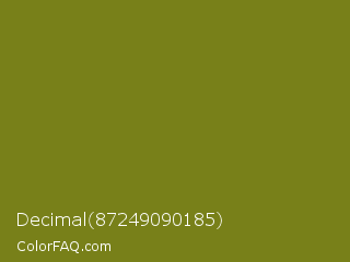 Decimal 87249090185 Color is a dark yellow color and the nearest color is Pacifika #778120. Hex code #788019 and RGB value is rgb(120,128,25). In RGB color space, this color is composed of 47% red, 50% green, 10% blue, In CMYK color space, this color is composed of 6% cyan, 0% magenta, 80% yellow , 50% black , In HSL color space, this color has a hue angle of 65° , 67% saturation and 30% lightness.