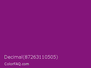 Decimal 87263110505 Color is a dark magenta color and the nearest color is Patriarch #800080. Hex code #841479 and RGB value is rgb(132,20,121). In RGB color space, this color is composed of 52% red, 8% green, 47% blue, In CMYK color space, this color is composed of 0% cyan, 85% magenta, 8% yellow , 48% black , In HSL color space, this color has a hue angle of 306° , 74% saturation and 30% lightness.