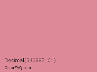 Decimal 340887161 Color is a light red color and the nearest color is Shimmering Blush #d98695. Hex code #dd8997 and RGB value is rgb(221,137,151). In RGB color space, this color is composed of 87% red, 54% green, 59% blue, In CMYK color space, this color is composed of 0% cyan, 38% magenta, 32% yellow , 13% black , In HSL color space, this color has a hue angle of 350° , 55% saturation and 70% lightness.