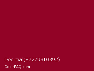 Decimal 87279310392 Color is a dark red color and the nearest color is Paprika #8d0226. Hex code #920326 and RGB value is rgb(146,3,38). In RGB color space, this color is composed of 57% red, 1% green, 15% blue, In CMYK color space, this color is composed of 0% cyan, 98% magenta, 74% yellow , 43% black , In HSL color space, this color has a hue angle of 345° , 96% saturation and 29% lightness.
