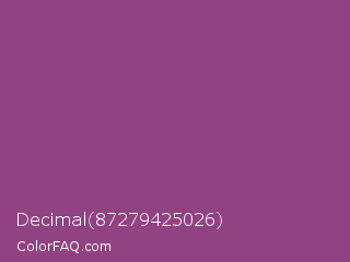 Decimal 87279425026 Color is a normal magenta color and the nearest color is Plum #8e4585. Hex code #924182 and RGB value is rgb(146,65,130). In RGB color space, this color is composed of 57% red, 25% green, 51% blue, In CMYK color space, this color is composed of 0% cyan, 55% magenta, 11% yellow , 43% black , In HSL color space, this color has a hue angle of 312° , 38% saturation and 41% lightness.