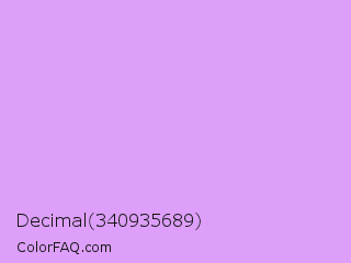 Decimal 340935689 Color is a light purple color and the nearest color is Bright Lilac #d891ef. Hex code #dd9ff9 and RGB value is rgb(221,159,249). In RGB color space, this color is composed of 87% red, 62% green, 98% blue, In CMYK color space, this color is composed of 11% cyan, 36% magenta, 0% yellow , 2% black , In HSL color space, this color has a hue angle of 281° , 88% saturation and 80% lightness.