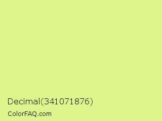 Decimal 341071876 Color is a light lime color and the nearest color is Mindaro #e3f988. Hex code #ddf38c and RGB value is rgb(221,243,140). In RGB color space, this color is composed of 87% red, 95% green, 55% blue, In CMYK color space, this color is composed of 9% cyan, 0% magenta, 42% yellow , 5% black , In HSL color space, this color has a hue angle of 73° , 81% saturation and 75% lightness.