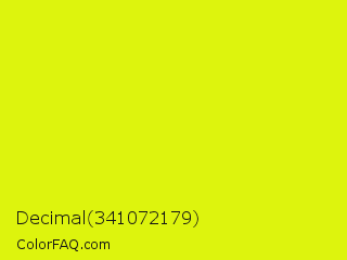 Decimal 341072179 Color is a normal yellow color and the nearest color is Chartreuse Yellow #dfff00. Hex code #ddf40d and RGB value is rgb(221,244,13). In RGB color space, this color is composed of 87% red, 96% green, 5% blue, In CMYK color space, this color is composed of 9% cyan, 0% magenta, 95% yellow , 4% black , In HSL color space, this color has a hue angle of 66° , 91% saturation and 50% lightness.