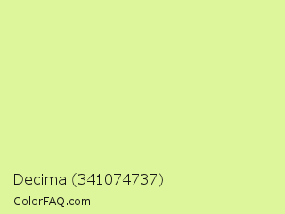 Decimal 341074737 Color is a light lime color and the nearest color is Key Lime #e8f48c. Hex code #ddf59b and RGB value is rgb(221,245,155). In RGB color space, this color is composed of 87% red, 96% green, 61% blue, In CMYK color space, this color is composed of 10% cyan, 0% magenta, 37% yellow , 4% black , In HSL color space, this color has a hue angle of 76° , 82% saturation and 78% lightness.