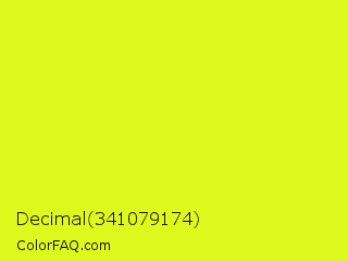 Decimal 341079174 Color is a normal yellow color and the nearest color is Arctic Lime #d0ff14. Hex code #ddfa1e and RGB value is rgb(221,250,30). In RGB color space, this color is composed of 87% red, 98% green, 12% blue, In CMYK color space, this color is composed of 12% cyan, 0% magenta, 88% yellow , 2% black , In HSL color space, this color has a hue angle of 68° , 96% saturation and 55% lightness.