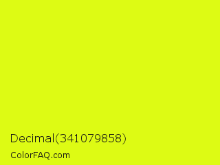 Decimal 341079858 Color is a normal yellow color and the nearest color is Arctic Lime #d0ff14. Hex code #ddfb14 and RGB value is rgb(221,251,20). In RGB color space, this color is composed of 87% red, 98% green, 8% blue, In CMYK color space, this color is composed of 12% cyan, 0% magenta, 92% yellow , 2% black , In HSL color space, this color has a hue angle of 68° , 97% saturation and 53% lightness.