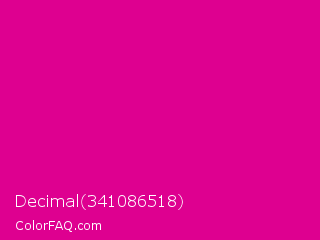 Decimal 341086518 Color is a normal magenta color and the nearest color is Mexican Pink #e4007c. Hex code #de0090 and RGB value is rgb(222,0,144). In RGB color space, this color is composed of 87% red, 0% green, 56% blue, In CMYK color space, this color is composed of 0% cyan, 100% magenta, 35% yellow , 13% black , In HSL color space, this color has a hue angle of 321° , 100% saturation and 44% lightness.