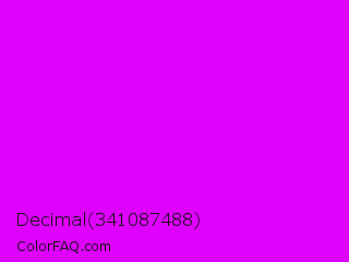 Decimal 341087488 Color is a normal magenta color and the nearest color is Phlox #df00ff. Hex code #de01fc and RGB value is rgb(222,1,252). In RGB color space, this color is composed of 87% red, 0% green, 99% blue, In CMYK color space, this color is composed of 12% cyan, 100% magenta, 0% yellow , 1% black , In HSL color space, this color has a hue angle of 293° , 99% saturation and 50% lightness.