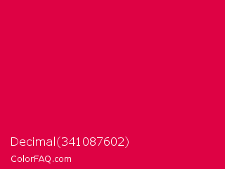 Decimal 341087602 Color is a normal rose color and the nearest color is Rich Carmine #d70040. Hex code #de0244 and RGB value is rgb(222,2,68). In RGB color space, this color is composed of 87% red, 1% green, 27% blue, In CMYK color space, this color is composed of 0% cyan, 99% magenta, 69% yellow , 13% black , In HSL color space, this color has a hue angle of 342° , 98% saturation and 44% lightness.