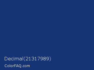 Decimal 21317989 Color is a dark blue color and the nearest color is St Patricks Blue #23297a. Hex code #163375 and RGB value is rgb(22,51,117). In RGB color space, this color is composed of 9% red, 20% green, 46% blue, In CMYK color space, this color is composed of 81% cyan, 56% magenta, 0% yellow , 54% black , In HSL color space, this color has a hue angle of 222° , 68% saturation and 27% lightness.