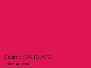 Decimal 341131670 Color is a normal rose color and the nearest color is Ruby #e0115f. Hex code #de1454 and RGB value is rgb(222,20,84). In RGB color space, this color is composed of 87% red, 8% green, 33% blue, In CMYK color space, this color is composed of 0% cyan, 91% magenta, 62% yellow , 13% black , In HSL color space, this color has a hue angle of 341° , 83% saturation and 47% lightness.
