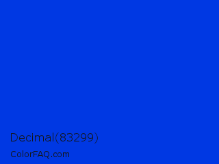 Decimal 83299 Color is a normal blue color and the nearest color is Blue RYB #0247fe. Hex code #0038e3 and RGB value is rgb(0,56,227). In RGB color space, this color is composed of 0% red, 22% green, 89% blue, In CMYK color space, this color is composed of 100% cyan, 75% magenta, 0% yellow , 11% black , In HSL color space, this color has a hue angle of 225° , 100% saturation and 45% lightness.