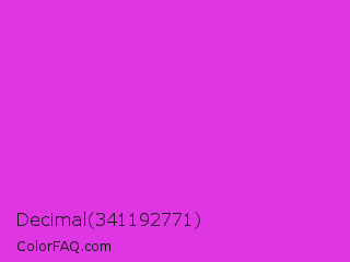 Decimal 341192771 Color is a normal magenta color and the nearest color is Steel Pink #cc33cc. Hex code #de36e3 and RGB value is rgb(222,54,227). In RGB color space, this color is composed of 87% red, 21% green, 89% blue, In CMYK color space, this color is composed of 2% cyan, 76% magenta, 0% yellow , 11% black , In HSL color space, this color has a hue angle of 298° , 76% saturation and 55% lightness.