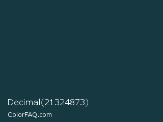 Decimal 21324873 Color is a very dark cyan color and the nearest color is Elephant #123447. Hex code #163941 and RGB value is rgb(22,57,65). In RGB color space, this color is composed of 9% red, 22% green, 25% blue, In CMYK color space, this color is composed of 66% cyan, 12% magenta, 0% yellow , 75% black , In HSL color space, this color has a hue angle of 191° , 49% saturation and 17% lightness.