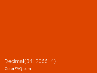 Decimal 341206614 Color is a normal orange color and the nearest color is Grenadier #d54600. Hex code #de4500 and RGB value is rgb(222,69,0). In RGB color space, this color is composed of 87% red, 27% green, 0% blue, In CMYK color space, this color is composed of 0% cyan, 69% magenta, 100% yellow , 13% black , In HSL color space, this color has a hue angle of 19° , 100% saturation and 44% lightness.