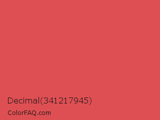 Decimal 341217945 Color is a normal red color and the nearest color is Jelly Bean #da614e. Hex code #de4f53 and RGB value is rgb(222,79,83). In RGB color space, this color is composed of 87% red, 31% green, 33% blue, In CMYK color space, this color is composed of 0% cyan, 64% magenta, 63% yellow , 13% black , In HSL color space, this color has a hue angle of 358° , 68% saturation and 59% lightness.
