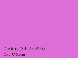 Decimal 341275495 Color is a light magenta color and the nearest color is Orchid #da70d6. Hex code #de6ed7 and RGB value is rgb(222,110,215). In RGB color space, this color is composed of 87% red, 43% green, 84% blue, In CMYK color space, this color is composed of 0% cyan, 50% magenta, 3% yellow , 13% black , In HSL color space, this color has a hue angle of 304° , 63% saturation and 65% lightness.