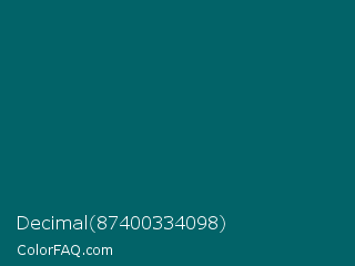 Decimal 87400334098 Color is a very dark cyan color and the nearest color is Blue Stone #016162. Hex code #026368 and RGB value is rgb(2,99,104). In RGB color space, this color is composed of 1% red, 39% green, 41% blue, In CMYK color space, this color is composed of 98% cyan, 5% magenta, 0% yellow , 59% black , In HSL color space, this color has a hue angle of 183° , 96% saturation and 21% lightness.