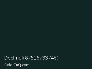 Decimal 87516733746 Color is a very dark cyan color and the nearest color is Dark Jungle Green #1a2421. Hex code #102624 and RGB value is rgb(16,38,36). In RGB color space, this color is composed of 6% red, 15% green, 14% blue, In CMYK color space, this color is composed of 58% cyan, 0% magenta, 5% yellow , 85% black , In HSL color space, this color has a hue angle of 175° , 41% saturation and 11% lightness.