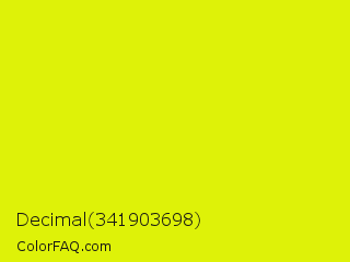 Decimal 341903698 Color is a normal yellow color and the nearest color is Chartreuse Yellow #dfff00. Hex code #def208 and RGB value is rgb(222,242,8). In RGB color space, this color is composed of 87% red, 95% green, 3% blue, In CMYK color space, this color is composed of 8% cyan, 0% magenta, 97% yellow , 5% black , In HSL color space, this color has a hue angle of 65° , 94% saturation and 49% lightness.
