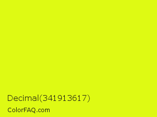 Decimal 341913617 Color is a normal yellow color and the nearest color is Arctic Lime #d0ff14. Hex code #defa13 and RGB value is rgb(222,250,19). In RGB color space, this color is composed of 87% red, 98% green, 7% blue, In CMYK color space, this color is composed of 11% cyan, 0% magenta, 92% yellow , 2% black , In HSL color space, this color has a hue angle of 67° , 96% saturation and 53% lightness.