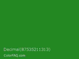 Decimal 87535211313 Color is a normal green color and the nearest color is Forest Green #228b22. Hex code #218823 and RGB value is rgb(33,136,35). In RGB color space, this color is composed of 13% red, 53% green, 14% blue, In CMYK color space, this color is composed of 76% cyan, 0% magenta, 74% yellow , 47% black , In HSL color space, this color has a hue angle of 121° , 61% saturation and 33% lightness.