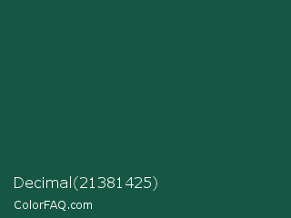 Decimal 21381425 Color is a very dark green color and the nearest color is Green Pea #1d6142. Hex code #165743 and RGB value is rgb(22,87,67). In RGB color space, this color is composed of 9% red, 34% green, 26% blue, In CMYK color space, this color is composed of 75% cyan, 0% magenta, 23% yellow , 66% black , In HSL color space, this color has a hue angle of 162° , 60% saturation and 21% lightness.