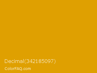 Decimal 342185097 Color is a normal orange color and the nearest color is Gamboge #e49b0f. Hex code #dfa001 and RGB value is rgb(223,160,1). In RGB color space, this color is composed of 87% red, 63% green, 0% blue, In CMYK color space, this color is composed of 0% cyan, 28% magenta, 100% yellow , 13% black , In HSL color space, this color has a hue angle of 43° , 99% saturation and 44% lightness.