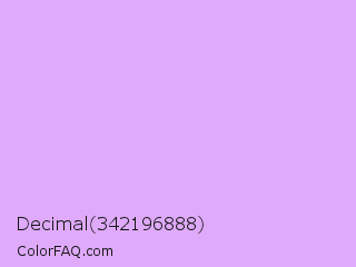 Decimal 342196888 Color is a very light purple color and the nearest color is Mauve #e0b0ff. Hex code #dfaafa and RGB value is rgb(223,170,250). In RGB color space, this color is composed of 87% red, 67% green, 98% blue, In CMYK color space, this color is composed of 11% cyan, 32% magenta, 0% yellow , 2% black , In HSL color space, this color has a hue angle of 280° , 89% saturation and 82% lightness.