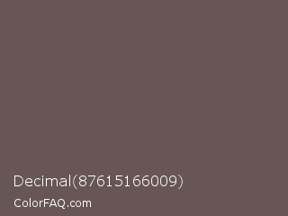 Decimal 87615166009 Color is a normal red color and the nearest color is Zambezi #685558. Hex code #685657 and RGB value is rgb(104,86,87). In RGB color space, this color is composed of 41% red, 34% green, 34% blue, In CMYK color space, this color is composed of 0% cyan, 17% magenta, 16% yellow , 59% black , In HSL color space, this color has a hue angle of 357° , 9% saturation and 37% lightness.