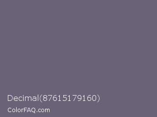 Decimal 87615179160 Color is a normal indigo color and the nearest color is Dolphin #646077. Hex code #686376 and RGB value is rgb(104,99,118). In RGB color space, this color is composed of 41% red, 39% green, 46% blue, In CMYK color space, this color is composed of 12% cyan, 16% magenta, 0% yellow , 54% black , In HSL color space, this color has a hue angle of 256° , 9% saturation and 43% lightness.