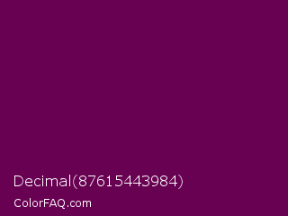 Decimal 87615443984 Color is a very dark magenta color and the nearest color is Pompadour #660045. Hex code #690152 and RGB value is rgb(105,1,82). In RGB color space, this color is composed of 41% red, 0% green, 32% blue, In CMYK color space, this color is composed of 0% cyan, 99% magenta, 22% yellow , 59% black , In HSL color space, this color has a hue angle of 313° , 98% saturation and 21% lightness.