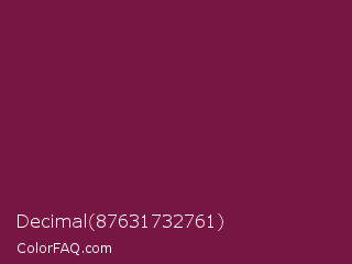 Decimal 87631732761 Color is a dark rose color and the nearest color is Pansy Purple #78184a. Hex code #771543 and RGB value is rgb(119,21,67). In RGB color space, this color is composed of 47% red, 8% green, 26% blue, In CMYK color space, this color is composed of 0% cyan, 82% magenta, 44% yellow , 53% black , In HSL color space, this color has a hue angle of 332° , 70% saturation and 27% lightness.