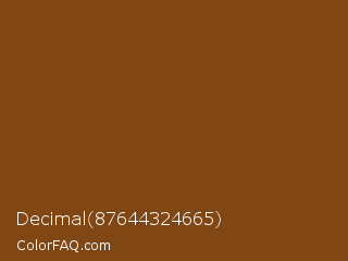 Decimal 87644324665 Color is a dark orange color and the nearest color is Russet #80461b. Hex code #804613 and RGB value is rgb(128,70,19). In RGB color space, this color is composed of 50% red, 27% green, 7% blue, In CMYK color space, this color is composed of 0% cyan, 45% magenta, 85% yellow , 50% black , In HSL color space, this color has a hue angle of 28° , 74% saturation and 29% lightness.